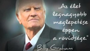 „Egy nap majd azt olvassák vagy hallják, hogy Billy Graham halott. Egy szót se higgyenek belőle. Sokkal elevenebb leszek, mint most vagyok. Csak a lakcímemet változtattam meg. Isten jelenlétébe léptem.” (Dr. Billy Graham) ( 1918 november 7.- 2018. február 21.) amerikai evangélista. Óriási házi és szabadtéri összejöveteleket tartott; prédikációit közvetítették a rádióban és a televízióban. Graham személyesen ismert 11 elnököt, Trumantől kezdve egészen George W. Bushig. Közülük tíznek barátja és hétnek közeli bizalmasa volt. Különösen közeli kapcsolatban volt Dwight David Eisenhowerrel, Lyndon Johnsonnal, akit Graham legközelebbi barátjának tartottak, Richard Nixonnal, Reagenékkel és a Bush családdal is. 1955-ben meghívta Martin Luther Kinget, hogy együtt hirdessenek az ébredésről New York városában, és letette érte az óvadékot, amikor az 1960-as években letartóztatták. Több helyre jutott el, mint kora bármelyik más prédikátora. Erről a képről és az idézetről jutott eszembe néhány évvel ezelőtt az alábbi pár gondolat, ami aztán egy kötetben is helyet kapott.