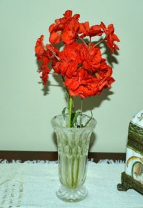Nagyon hiányzott már az eső, de ezen a köves, murvás felületen sosem látszik meg, hogy esett, mert abban a pillanatban elnyeli a talaj. Most örülök, meg bosszankodom is. A földnek kell a víz, a cseresznye meg érik és hamarosan a sok esőtől kireped, aztán megrohad mielőtt leszednénk. Éjjel nagy zuhé jött, és a muskátlikat kicsit megtépte a szél. Néhány virág a földön fejezte be a pályafutását. Most, egy kis vázában kapott pár nap esélyt a virulásra.